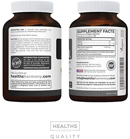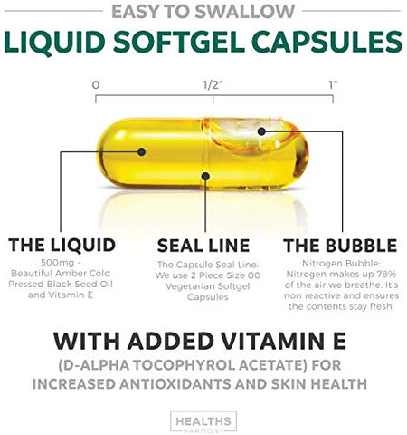 A Must-Have in Your Supplement Arsenal Introducing: Black Seed Oil from Healths Harmony With an arsenal of natural chemicals that help rejuvenate hair and protect skin, it's no wonder that black seed oil is making a name for itself around the world. 100% Cold Pressed: Like anything else, all the benefits in the world won't matter if you're not receiving it in pure, unfiltered form. We source our black seed oil from its natural home, squeeze it into a 500mg softgel with Vitamin E, and ship it right to you for maximum potency. Save Your Liver: Black seed oil serves to support your healthy liver. Product Safety: For people who are allergic to Black Seed, it may cause skin rashes, stomach upset, vomiting, or constipation. Consult a physician before use if you taking medications or supplements for these or any other conditions.