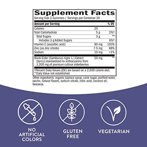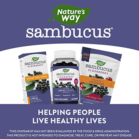 - Nature's Way Sambucus Elderberry Gummies support immune health with high potency vitamins C & D, and an excellent source of zinc. Gummies also contain highly concentrated (64x) black elderberry extract made from 3,200 mg of elderberries per serving.